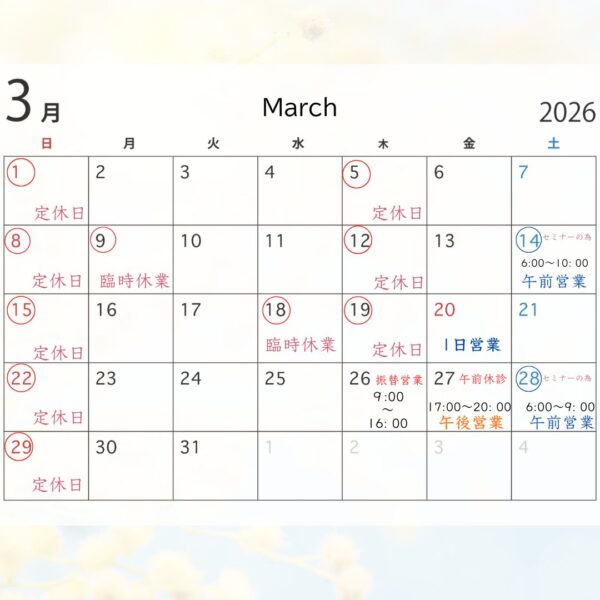 当院は働いている方が来院しやすいように平日は夜20時迄の営業。また、土曜日はお出かけする方、週末試合のアスリートの調整ができる様に朝6時から開院しております。