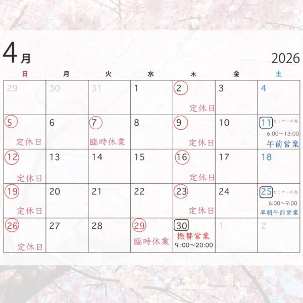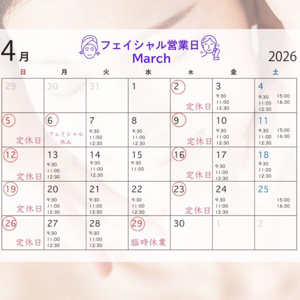 本日7日(火)は整体部門は臨時休業です。フェイシャル部門は11:00が空いております。